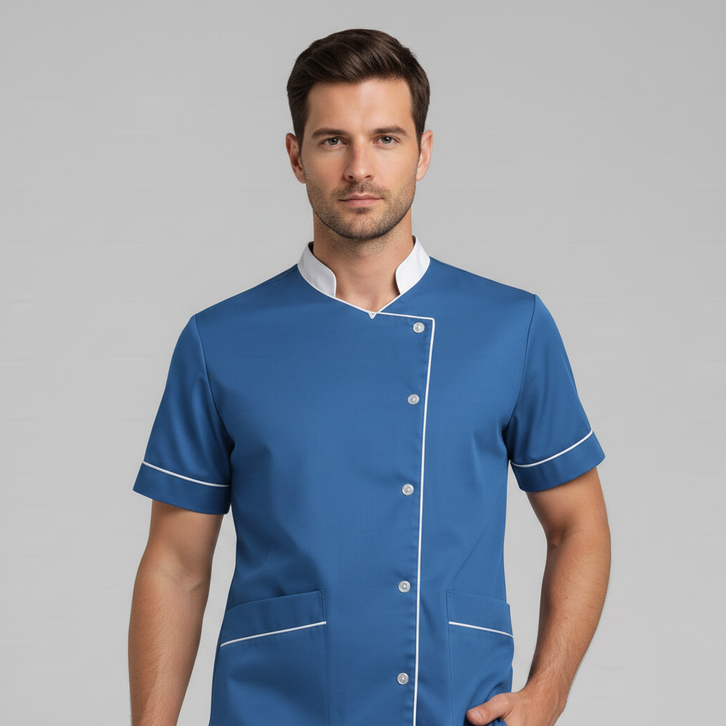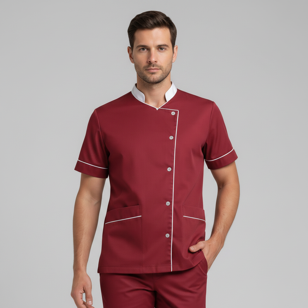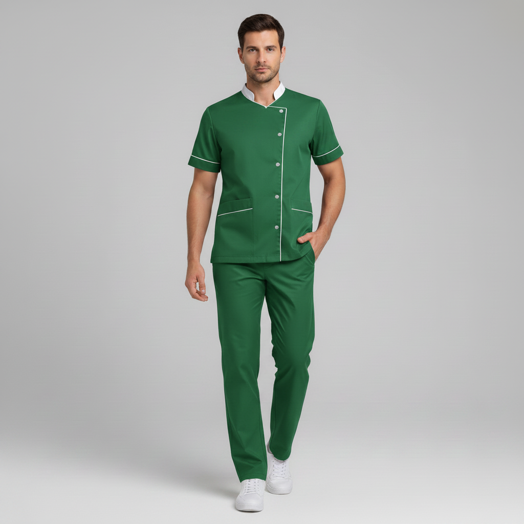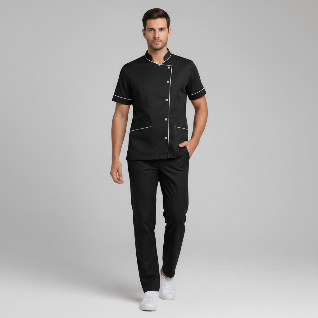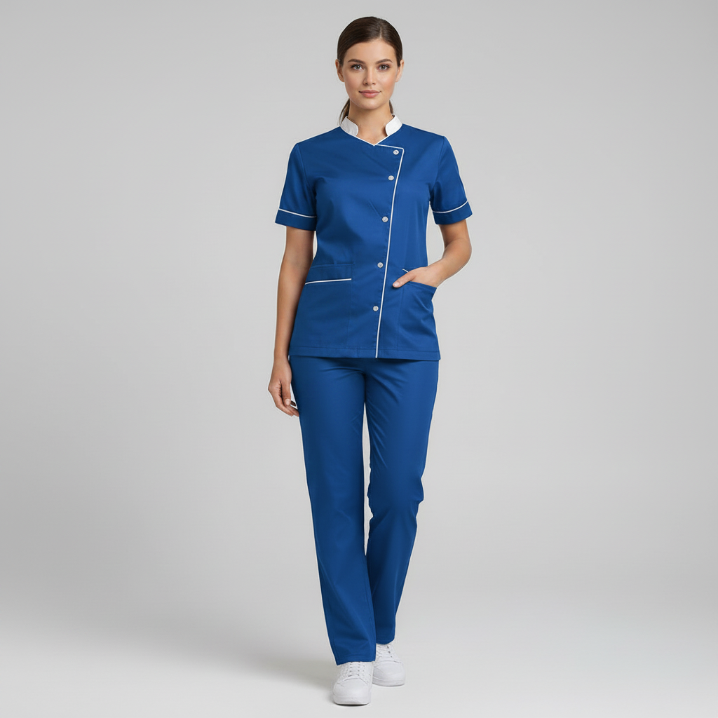 Product Overview Professional scrub set featuring a modern asymmetrical button-up top and matching trousers. Designed for a tailored fit and all-day comfort.