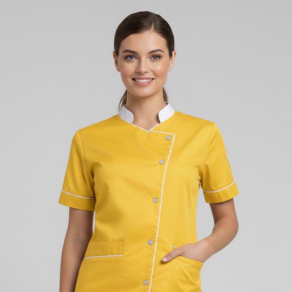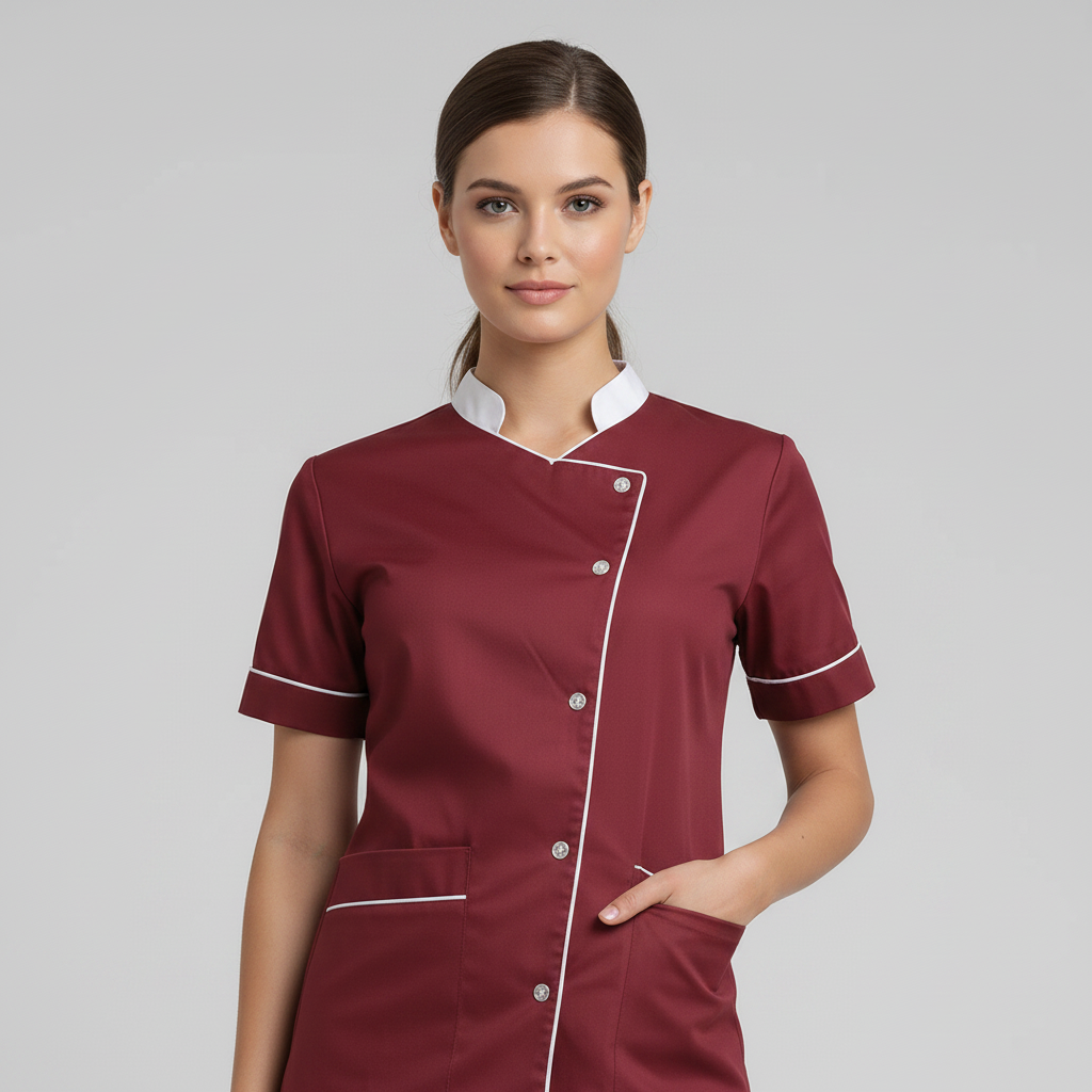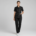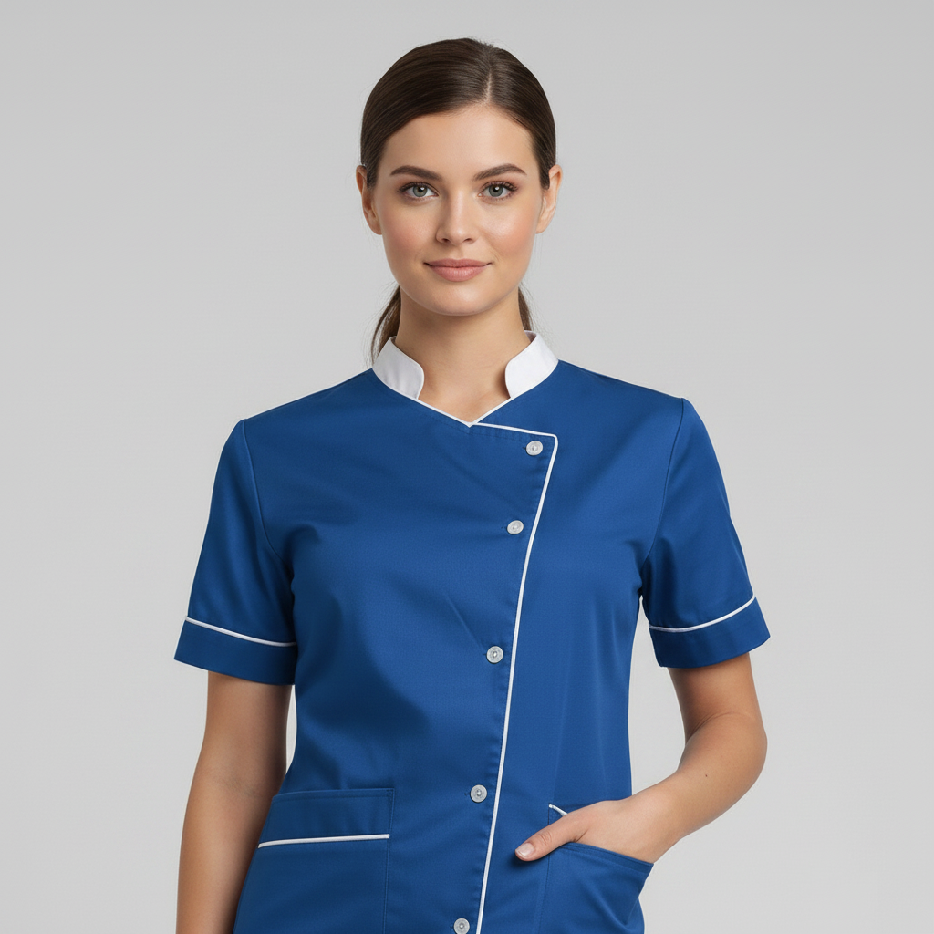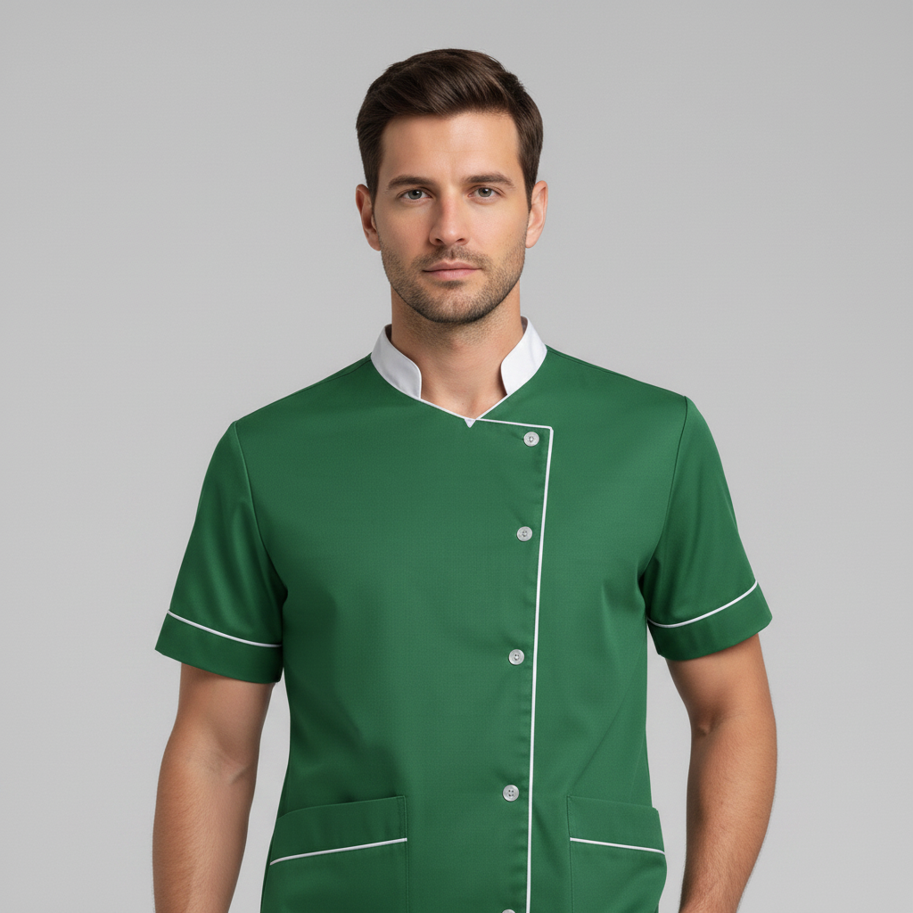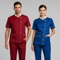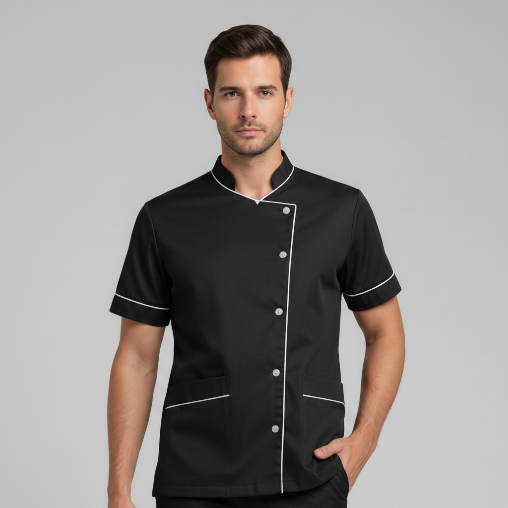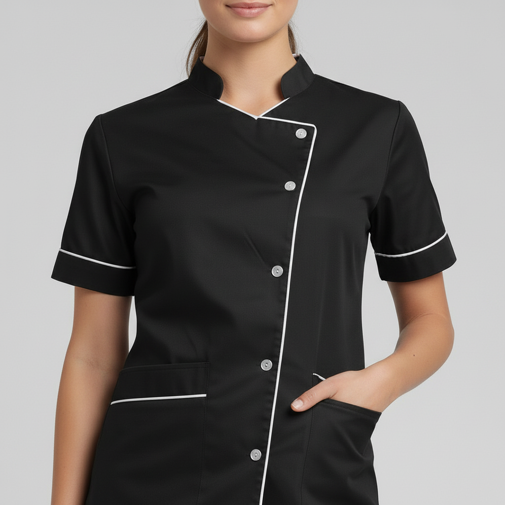 Product Overview Professional scrub set featuring a modern asymmetrical button-up top and matching trousers. Designed for a tailored fit and all-day comfort.