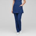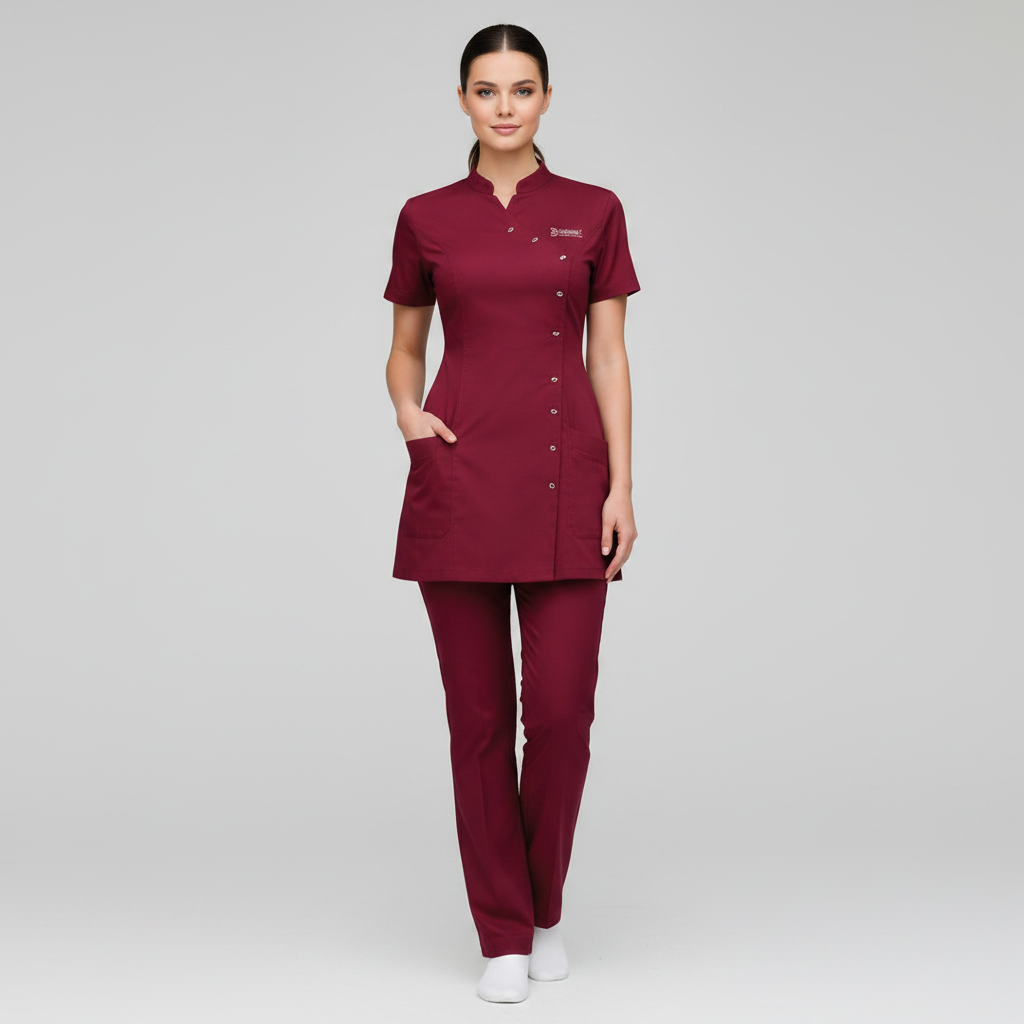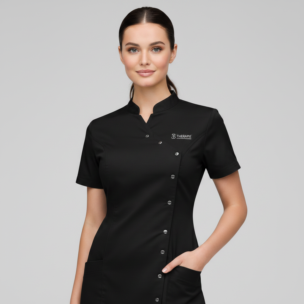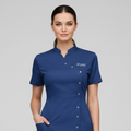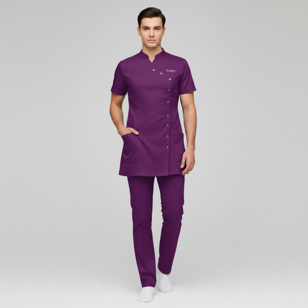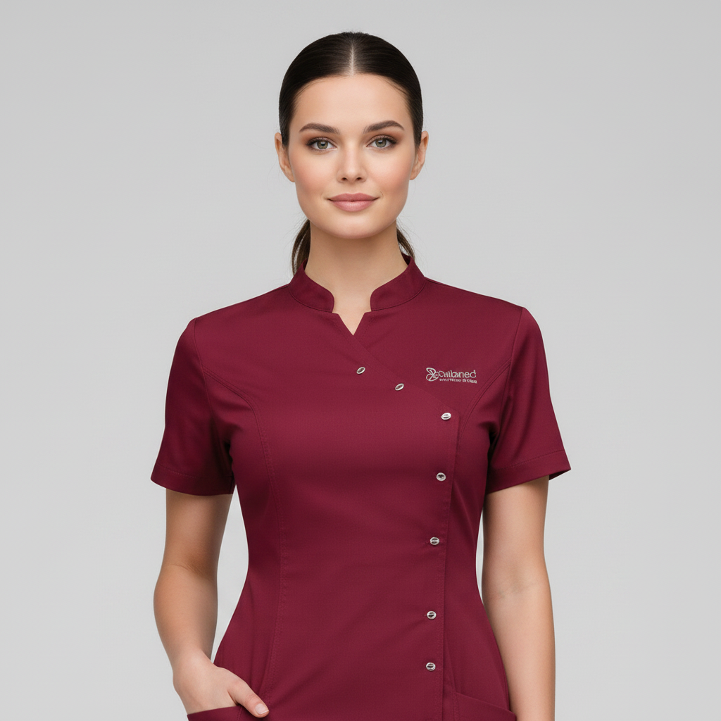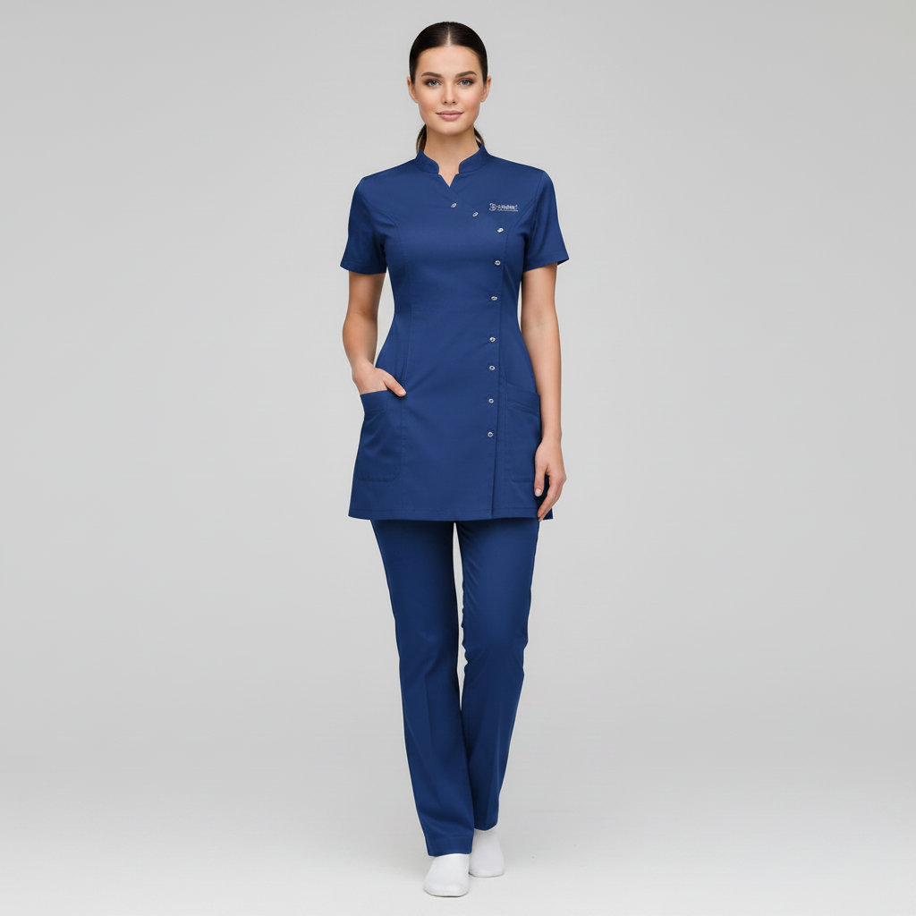 Product Overview A sophisticated, modern update to the professional medical uniform. This design features a unique cross-over front with a refined stand-up collar, offering a high-end look for clinical leaders and specialists.