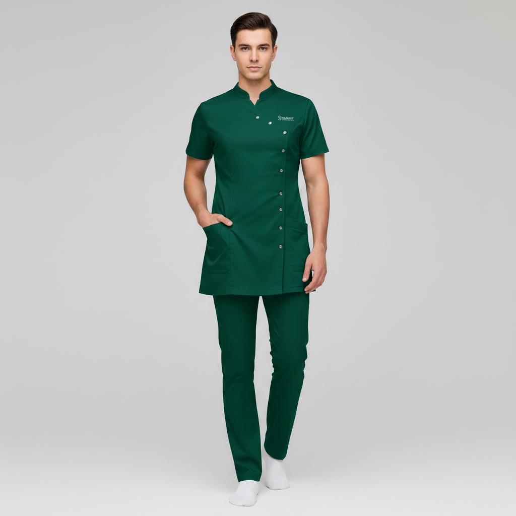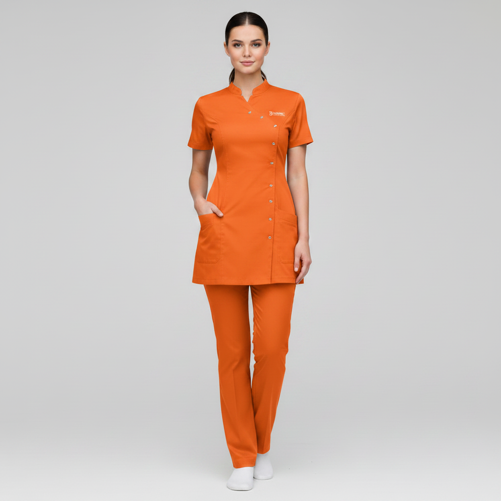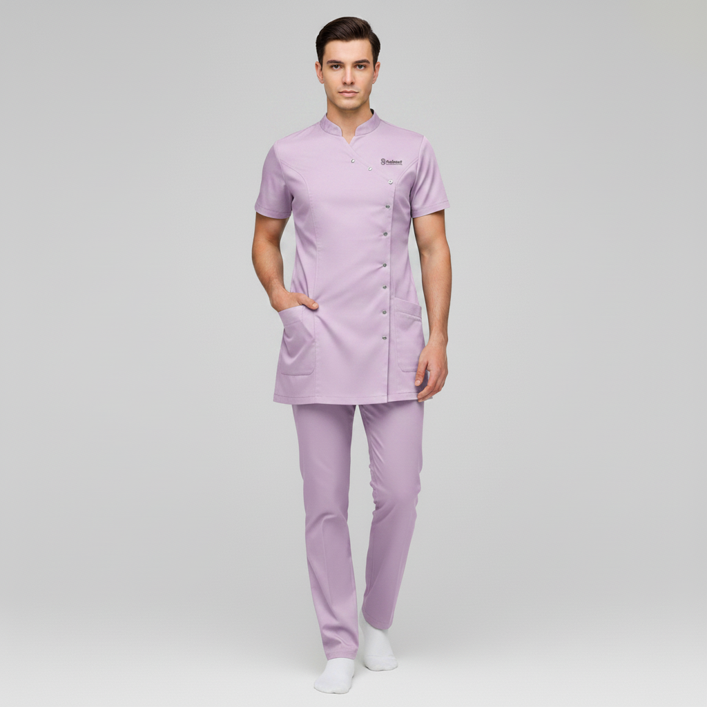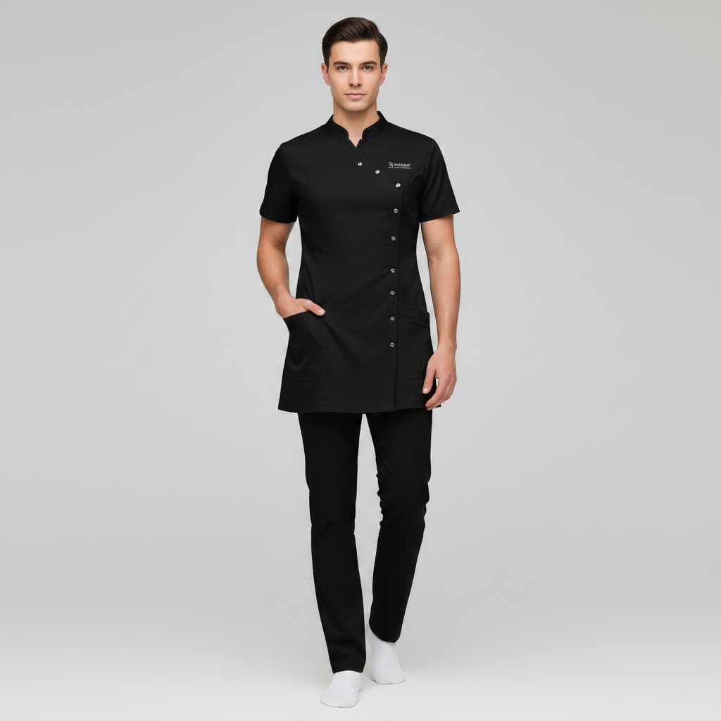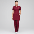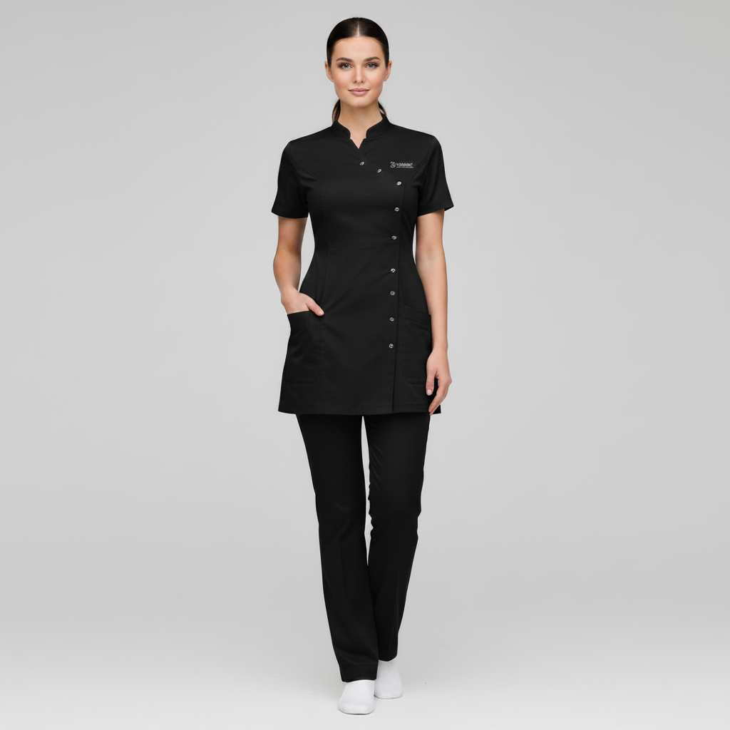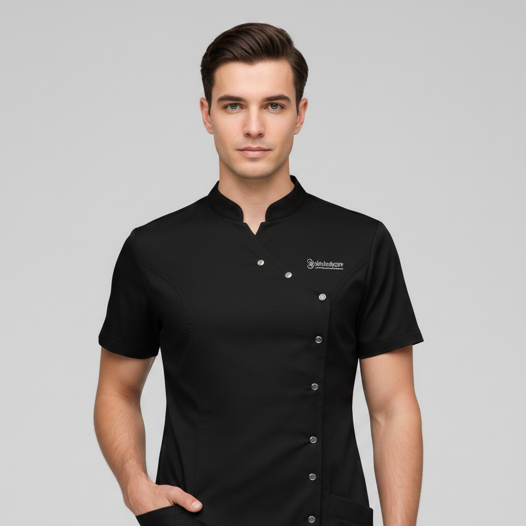 Product Overview A sophisticated, modern update to the professional medical uniform. This design features a unique cross-over front with a refined stand-up collar, offering a high-end look for clinical leaders and specialists.
