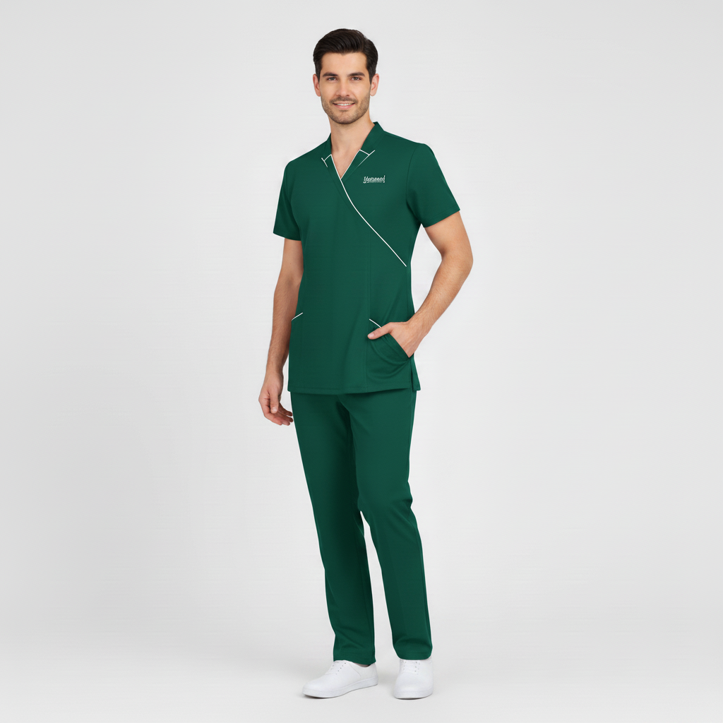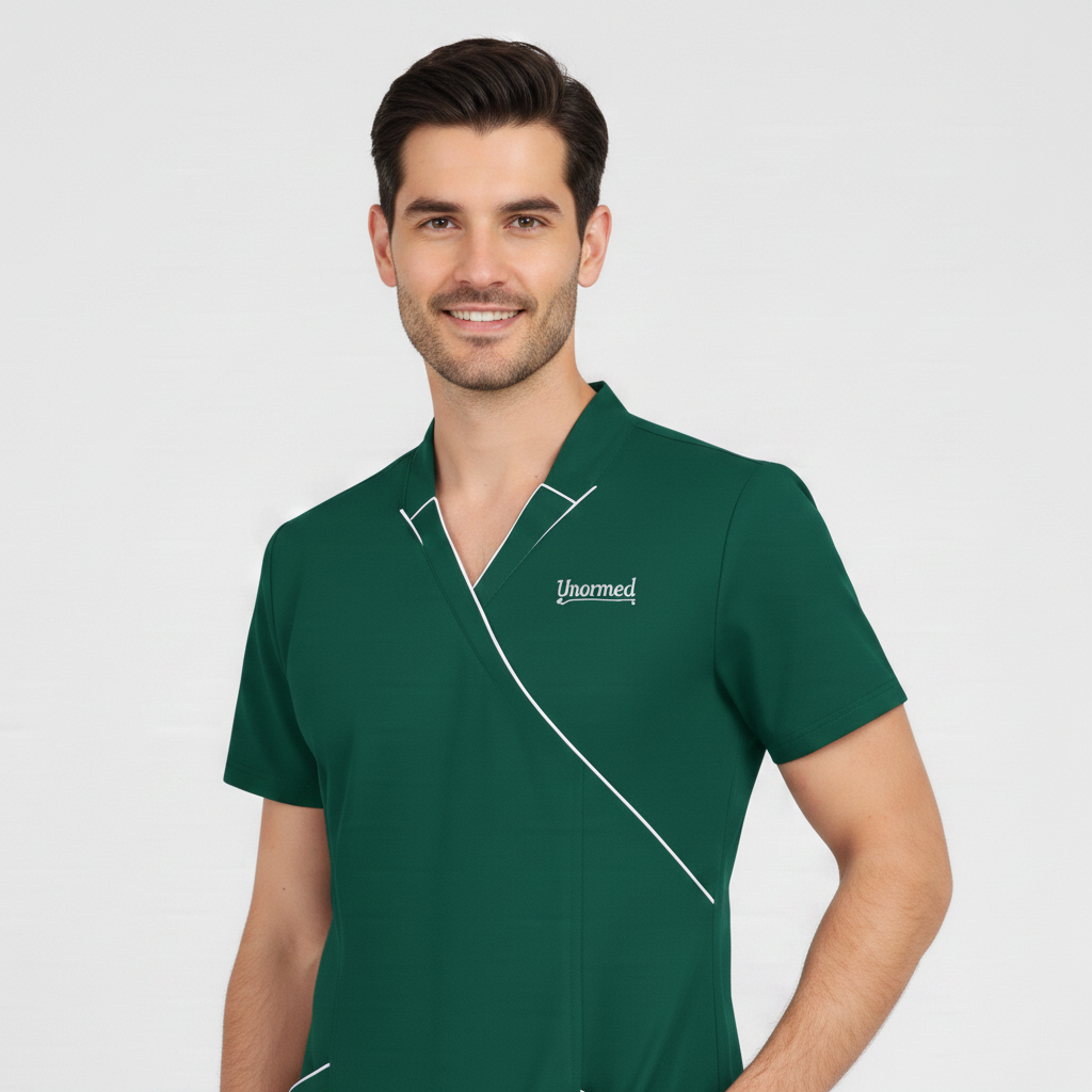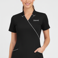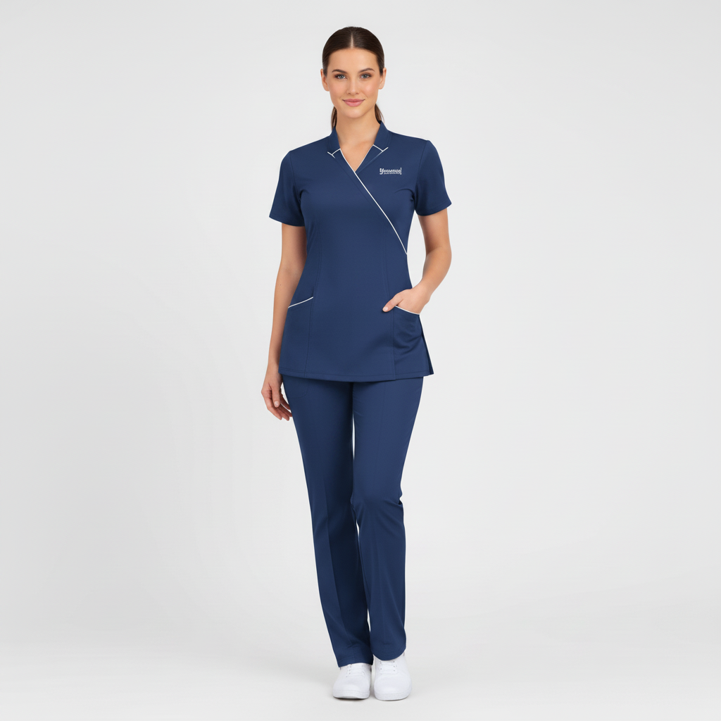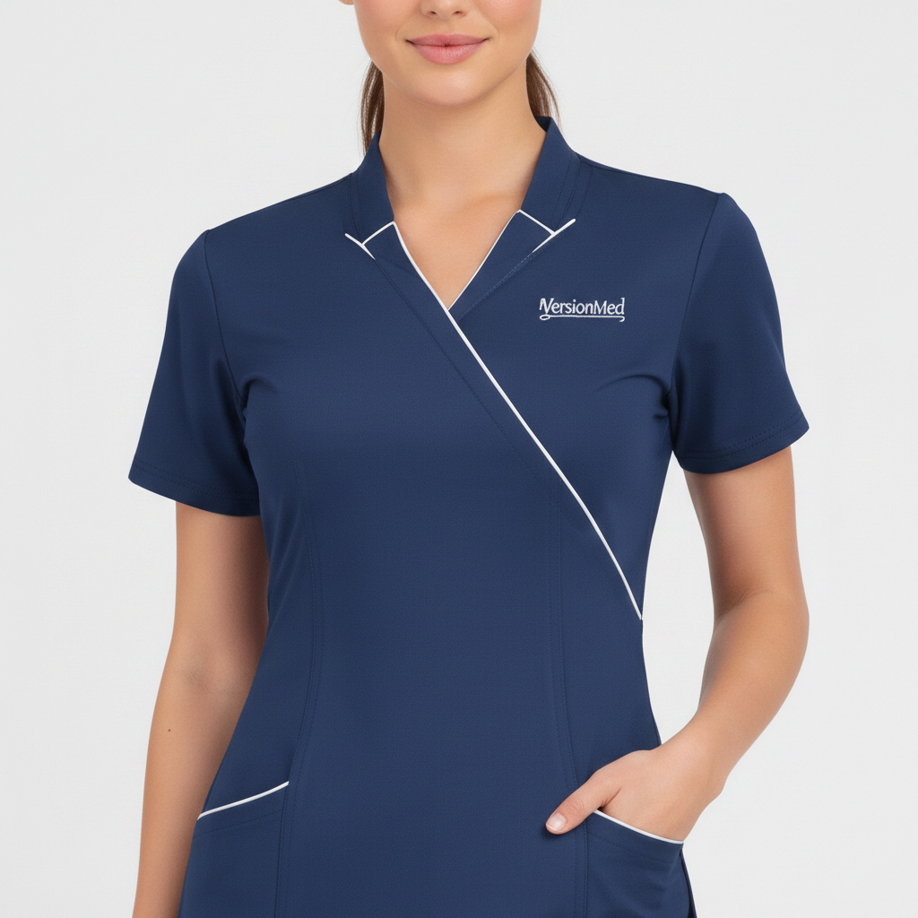 Product Overview A sophisticated wrap-style uniform that combines clinical functionality with high-end fashion. This design features a sharp V-neckline highlighted by contrast white piping, creating a professional "Signature" look for your practice.