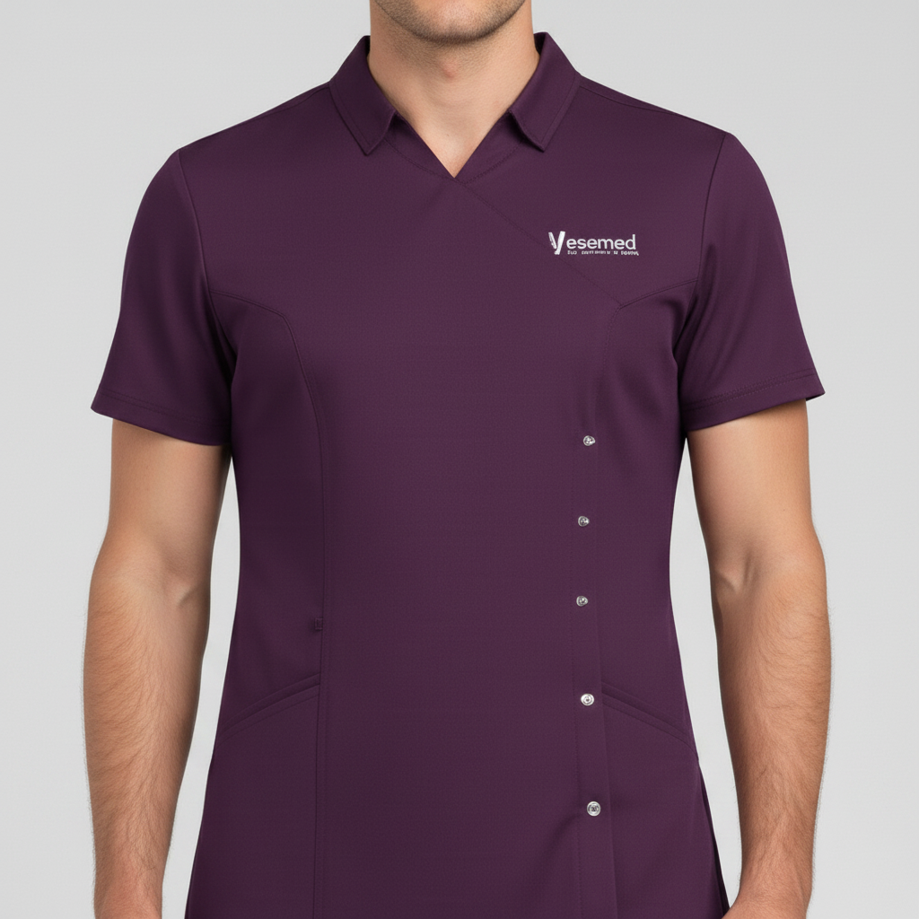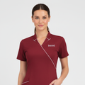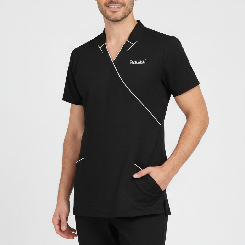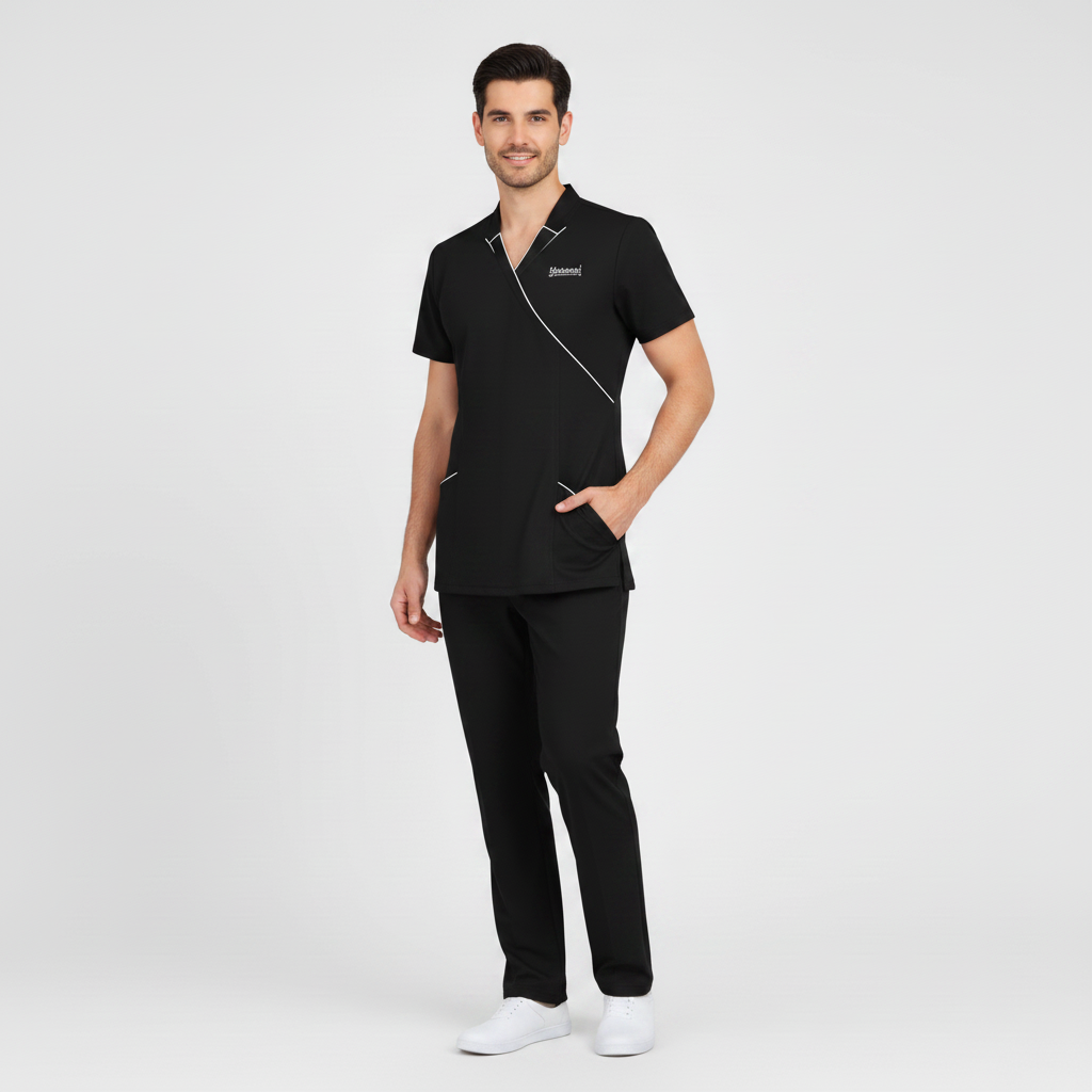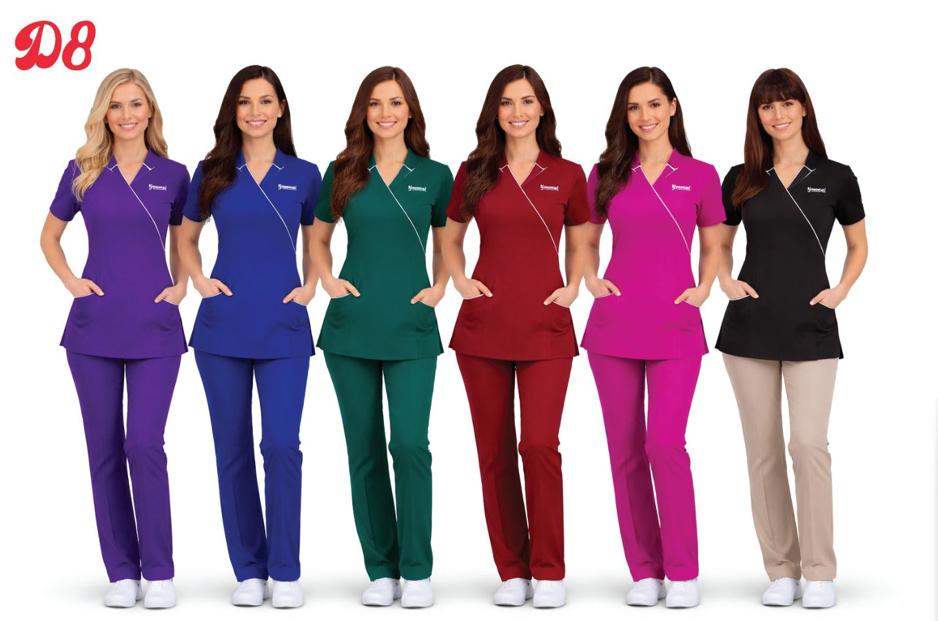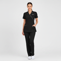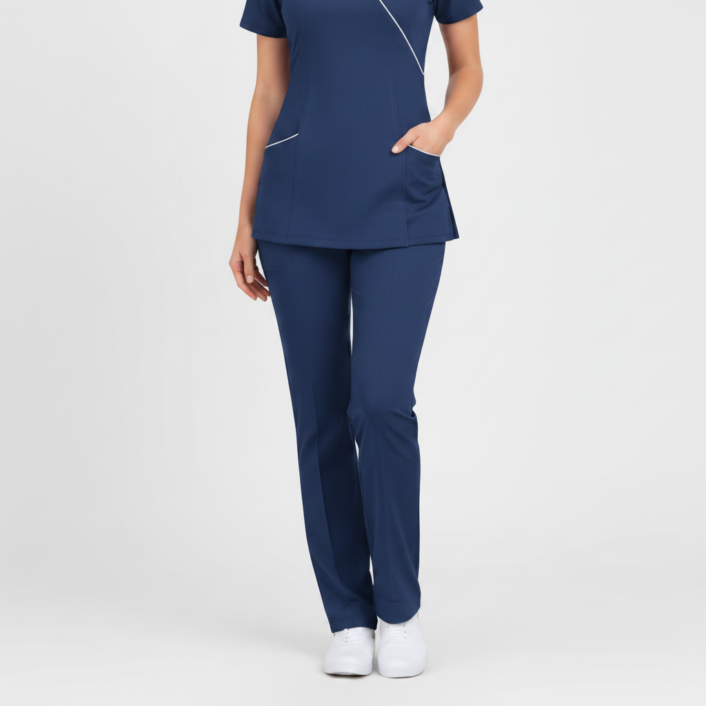 Product Overview A sophisticated wrap-style uniform that combines clinical functionality with high-end fashion. This design features a sharp V-neckline highlighted by contrast white piping, creating a professional "Signature" look for your practice.