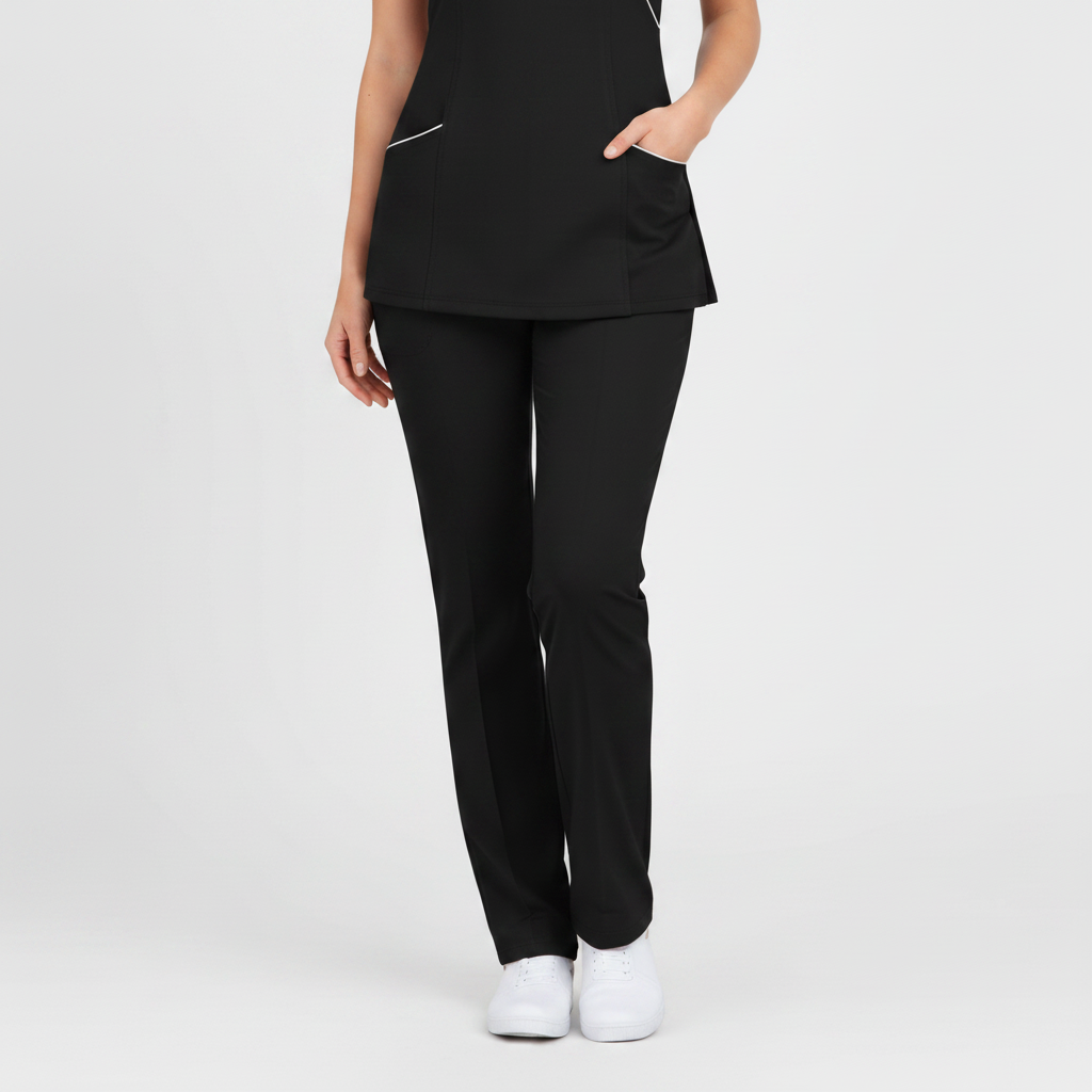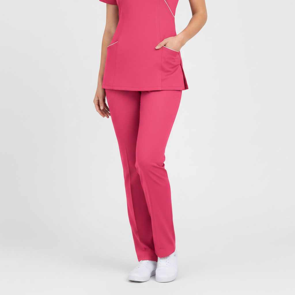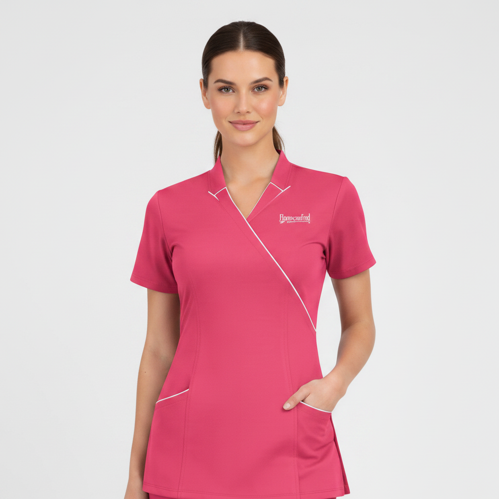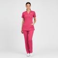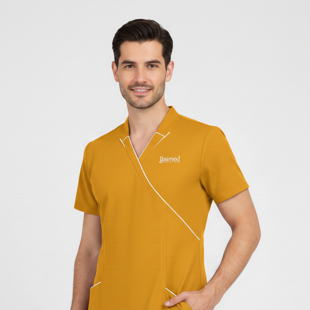 Product Overview A sophisticated wrap-style uniform that combines clinical functionality with high-end fashion. This design features a sharp V-neckline highlighted by contrast white piping, creating a professional "Signature" look for your practice.