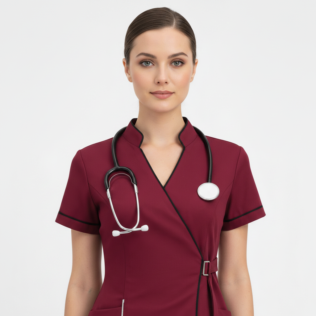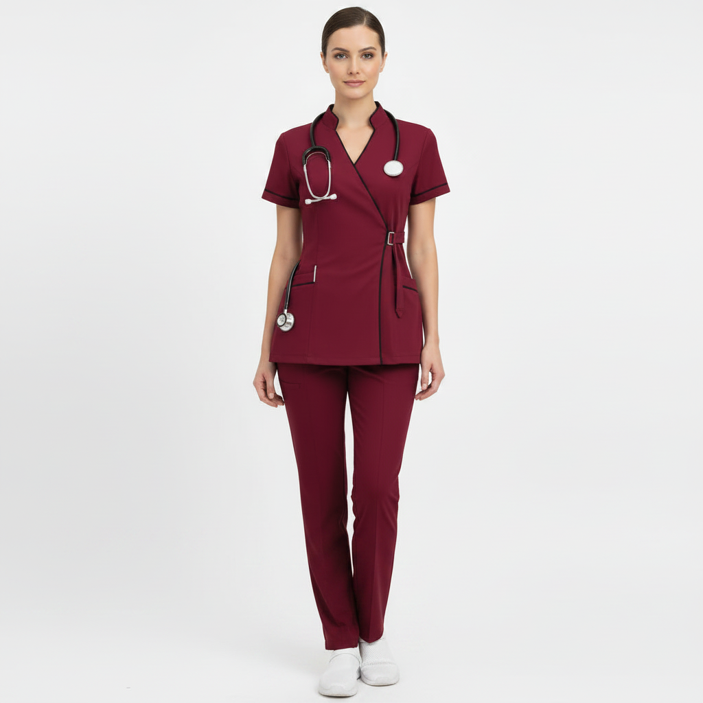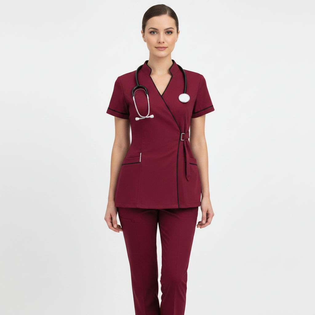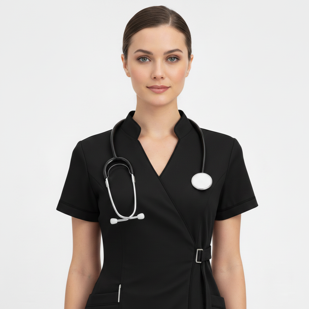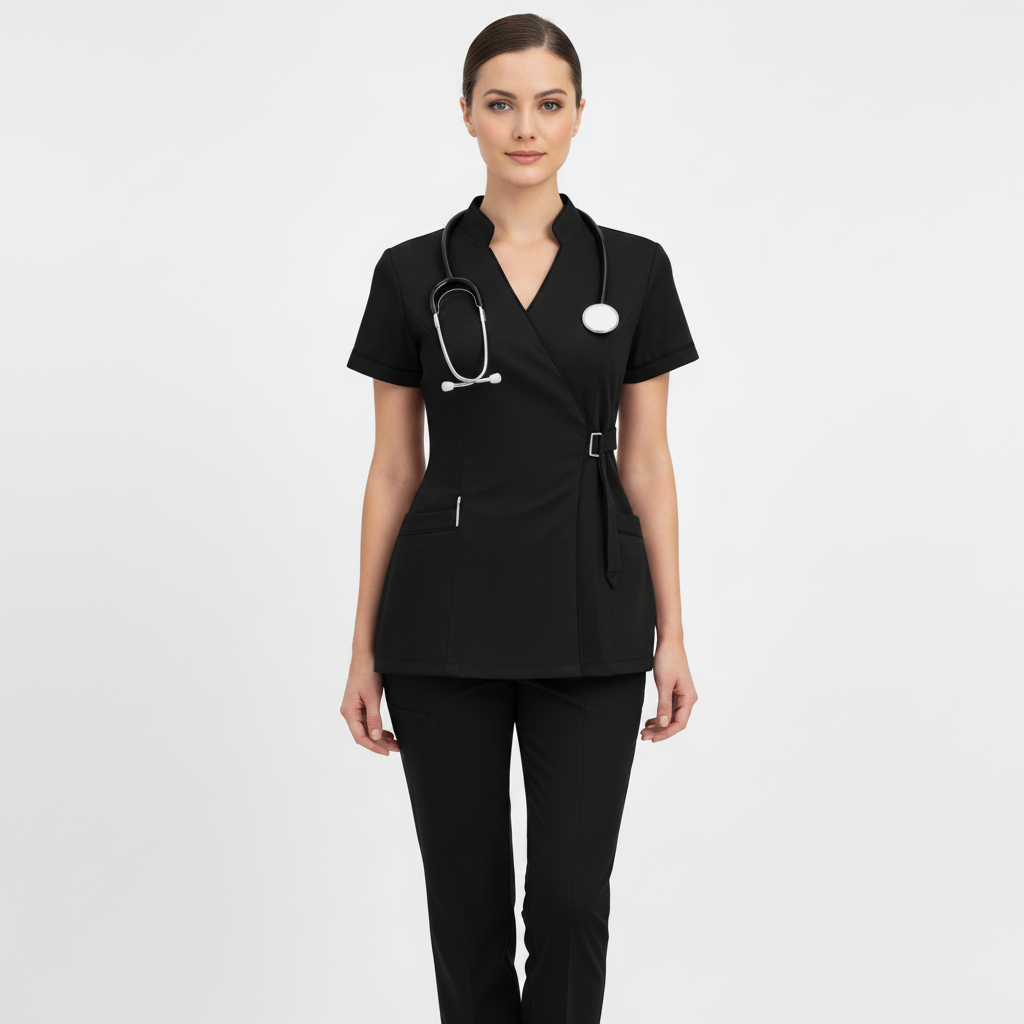 Product Overview A modern, clinical-chic uniform featuring a unique side-buckle closure. This design blends traditional professional style with a contemporary, high-fashion edge, perfect for those who want a standout look in the clinic.